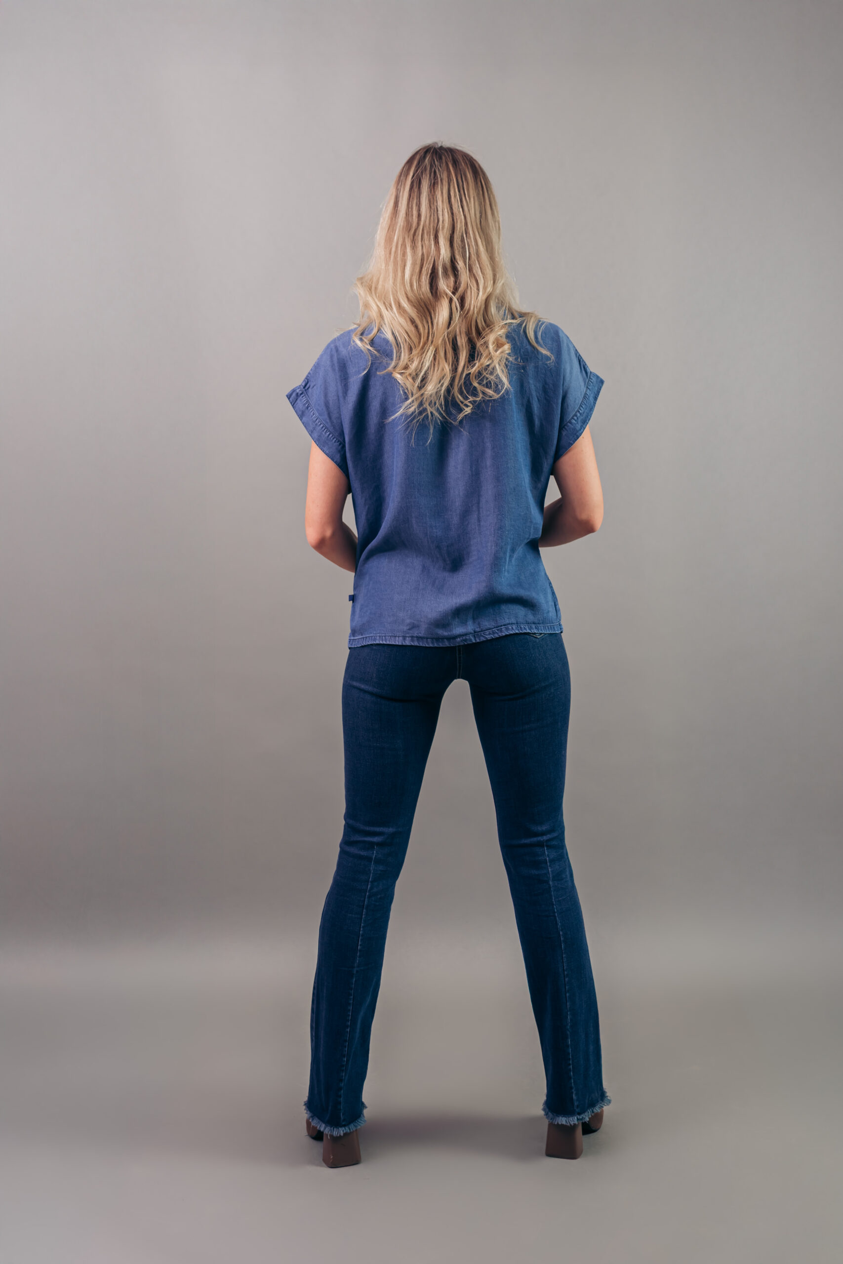 Cómoda blusa confeccionada en nuestra suave tela de denim, con un lavado azul, cuello clásico, un diseño espectacular con pinzas en la parte de adelante, botones en la parte delantera y manga corta.