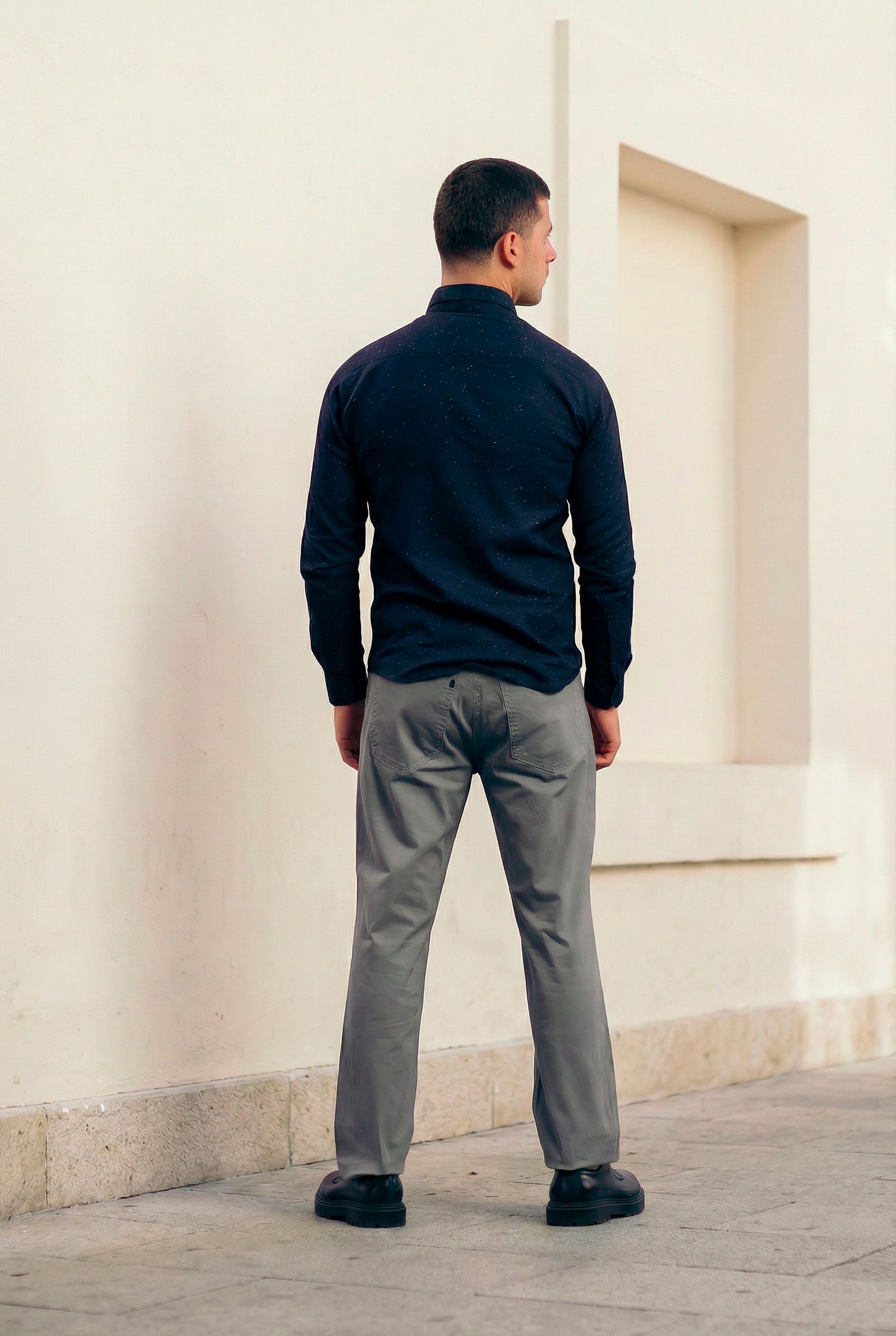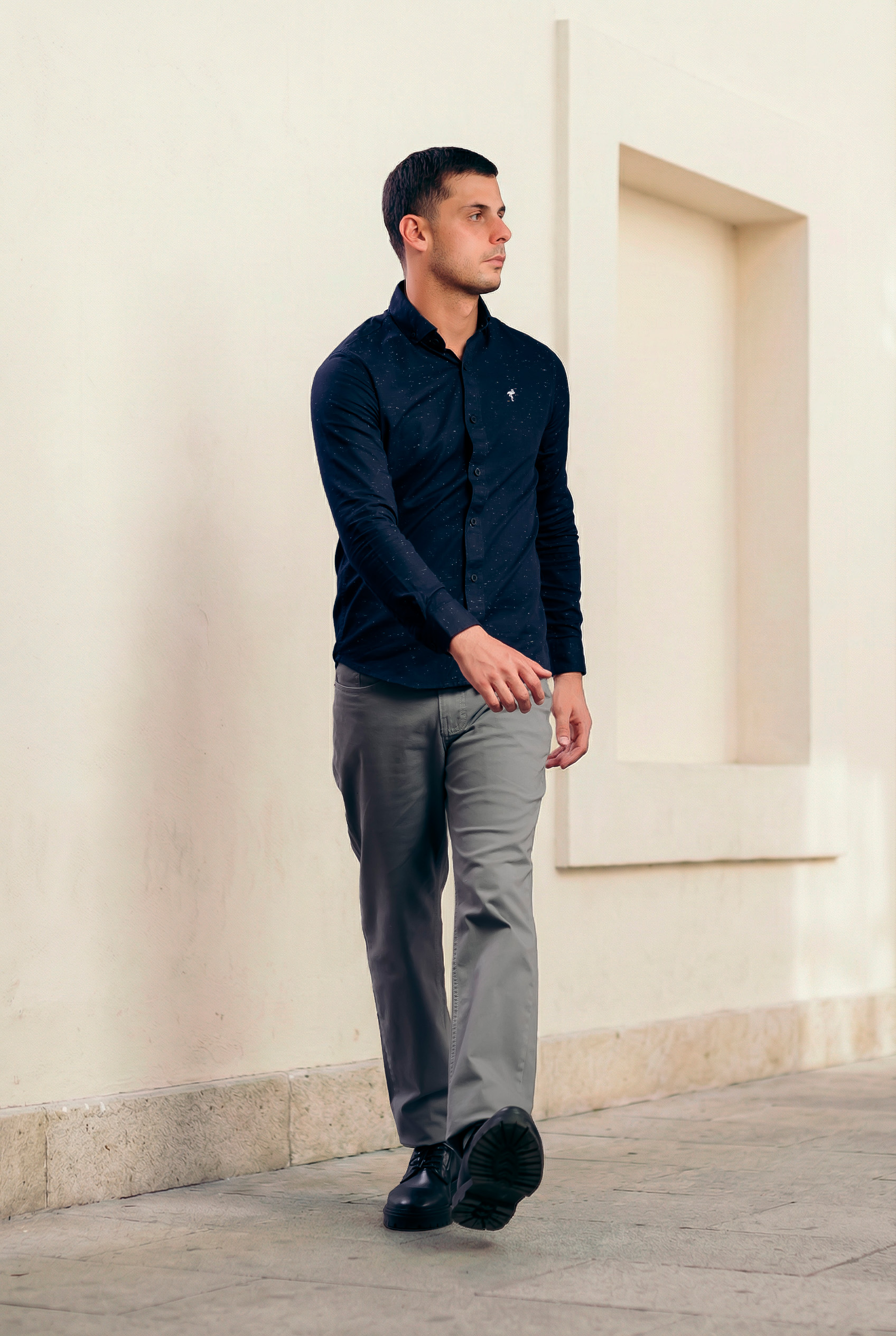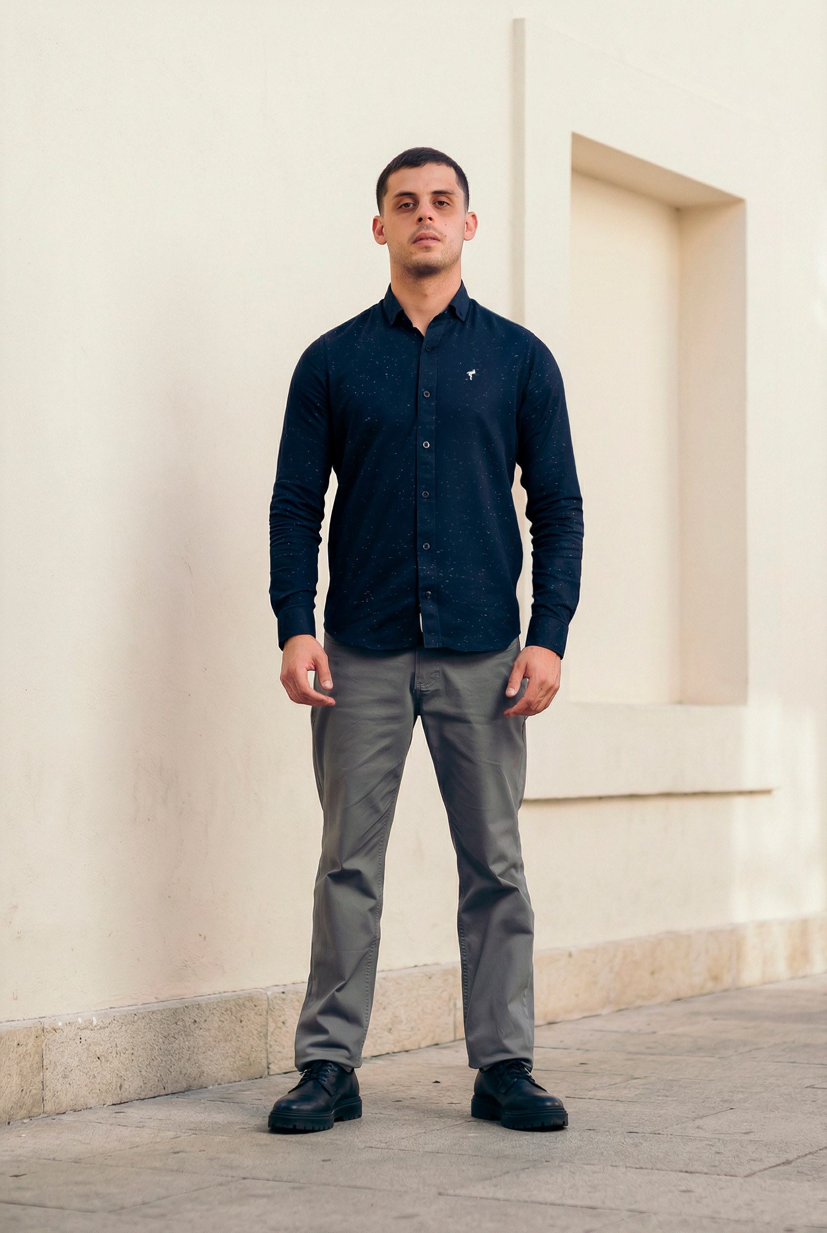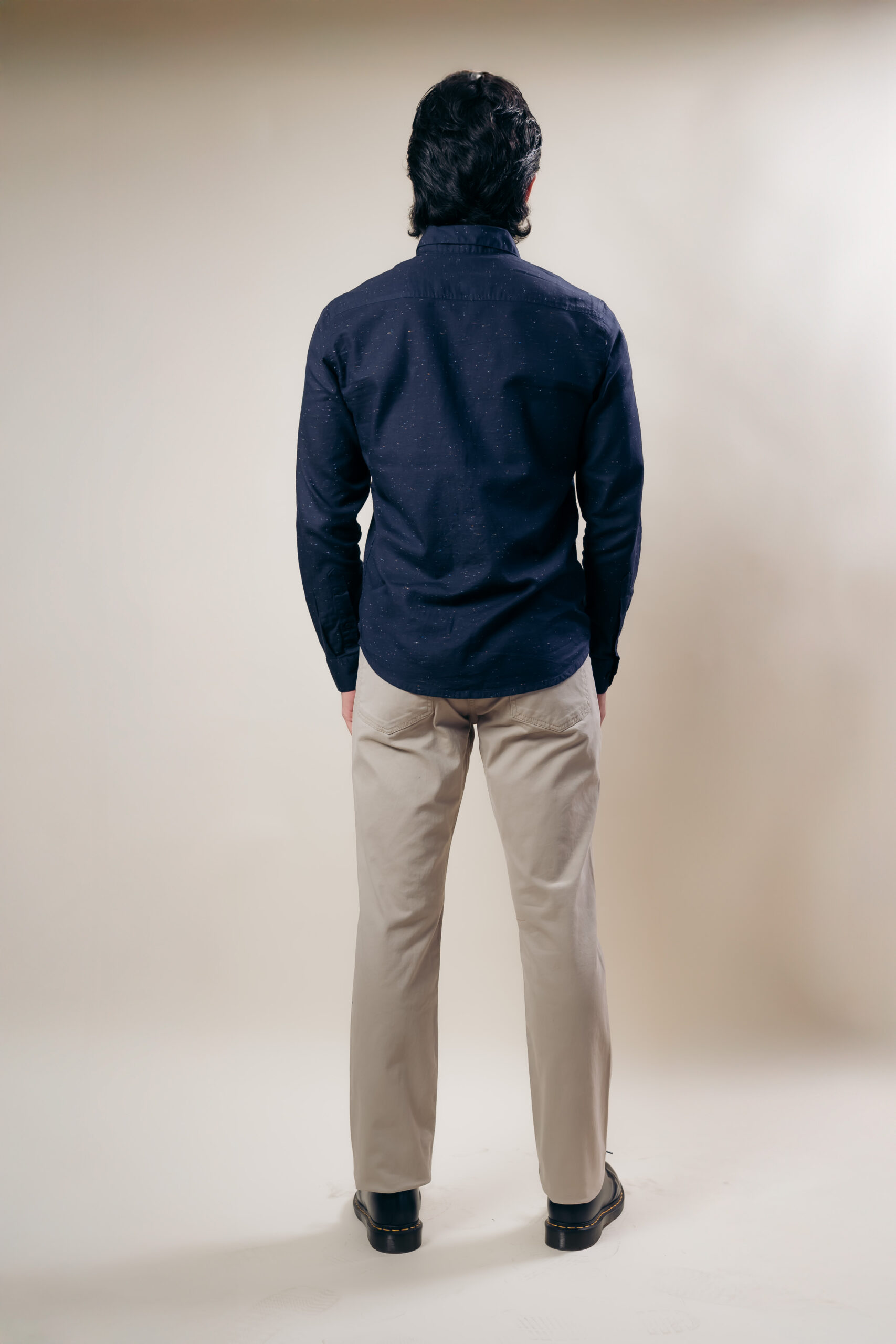 Cómoda camisa confeccionada en nuestra suave tela de algodón azul, con cuello clásico, manga larga.