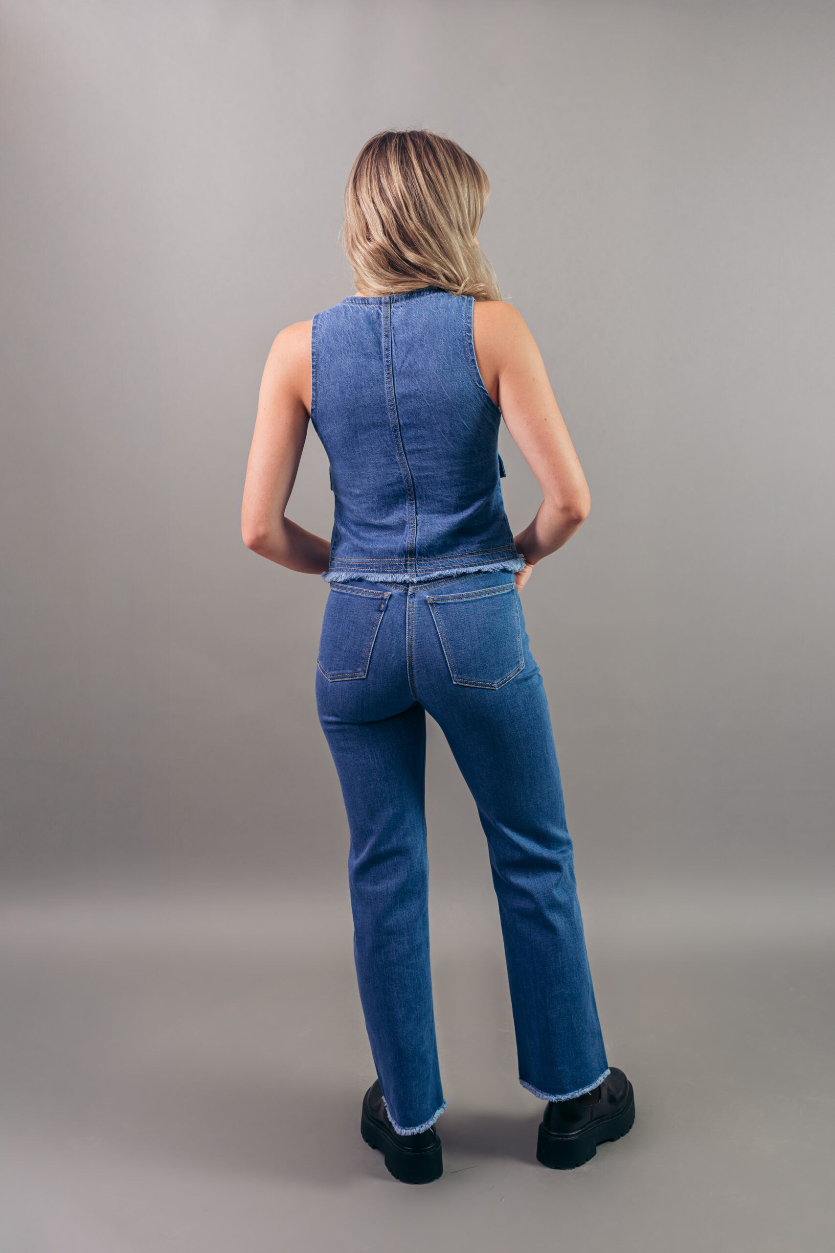 Chaleco confeccionada con nuestra suave tela de denim. Tiene figuras cuadradas de bolsillos en el frente, con botones en la parte de adelante.