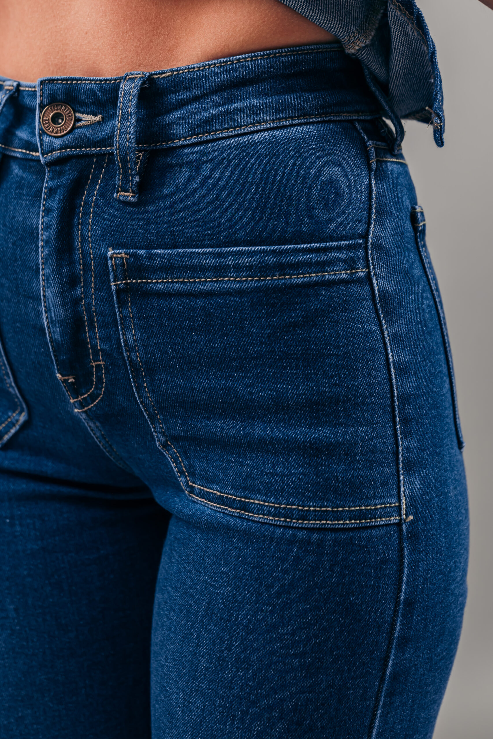 Pantalón Culotte de tiro alto de tendencia en nuestro cómodo denim para todo el día, basta alta, con un lavado azul, un diseño espectacular parchado los bolsillos delanteros. Lo puedes usar con una blusa por dentro o por fuera.