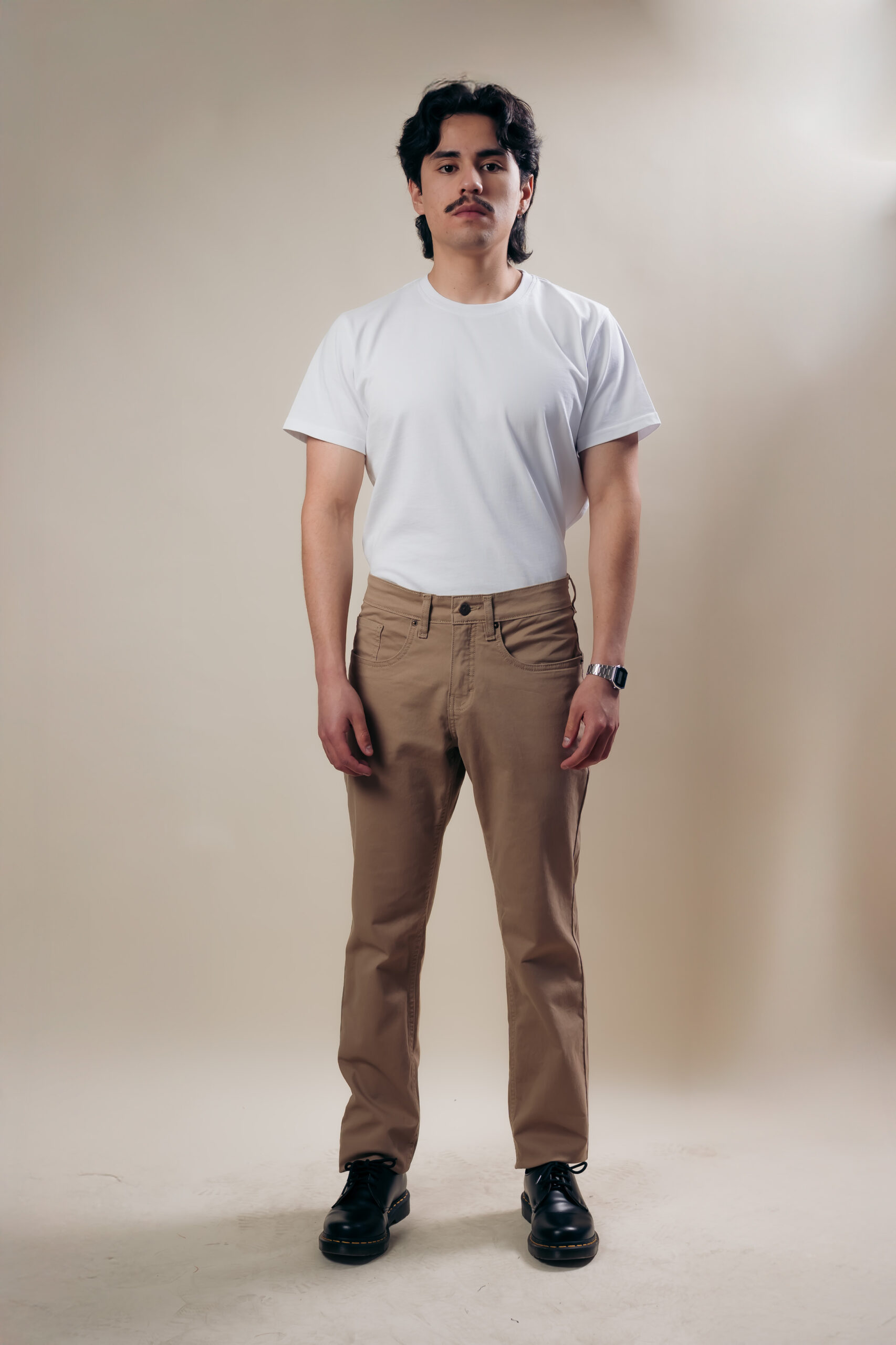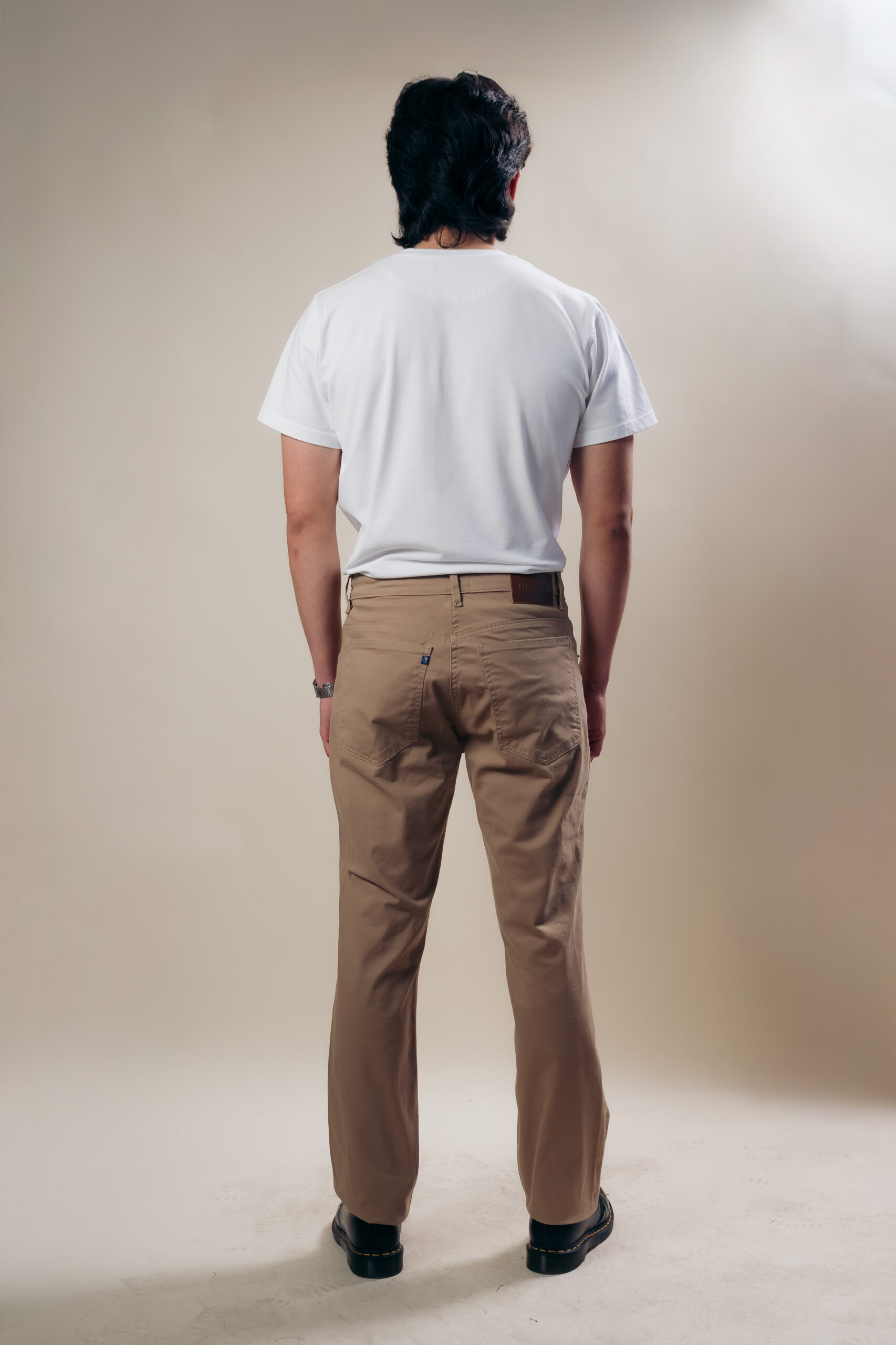 Pantalón con nuestra cómoda gabardina elástica para todo el día, con un color camel.
