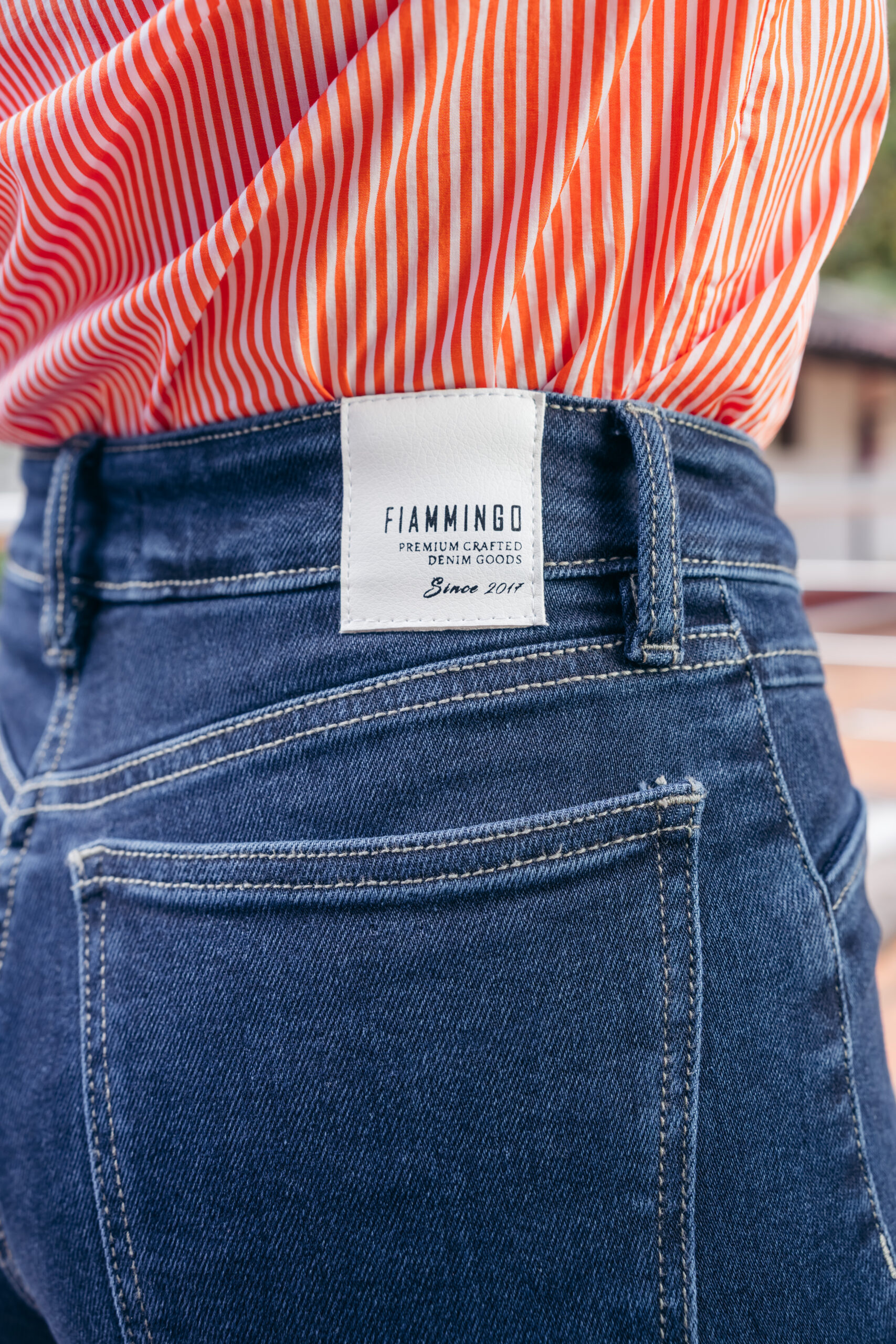 Jeans recto de tiro alto de tendencia en nuestro cómodo denim elástico para todo el día, con un lavado celeste y tiene una franja azul a los costados.